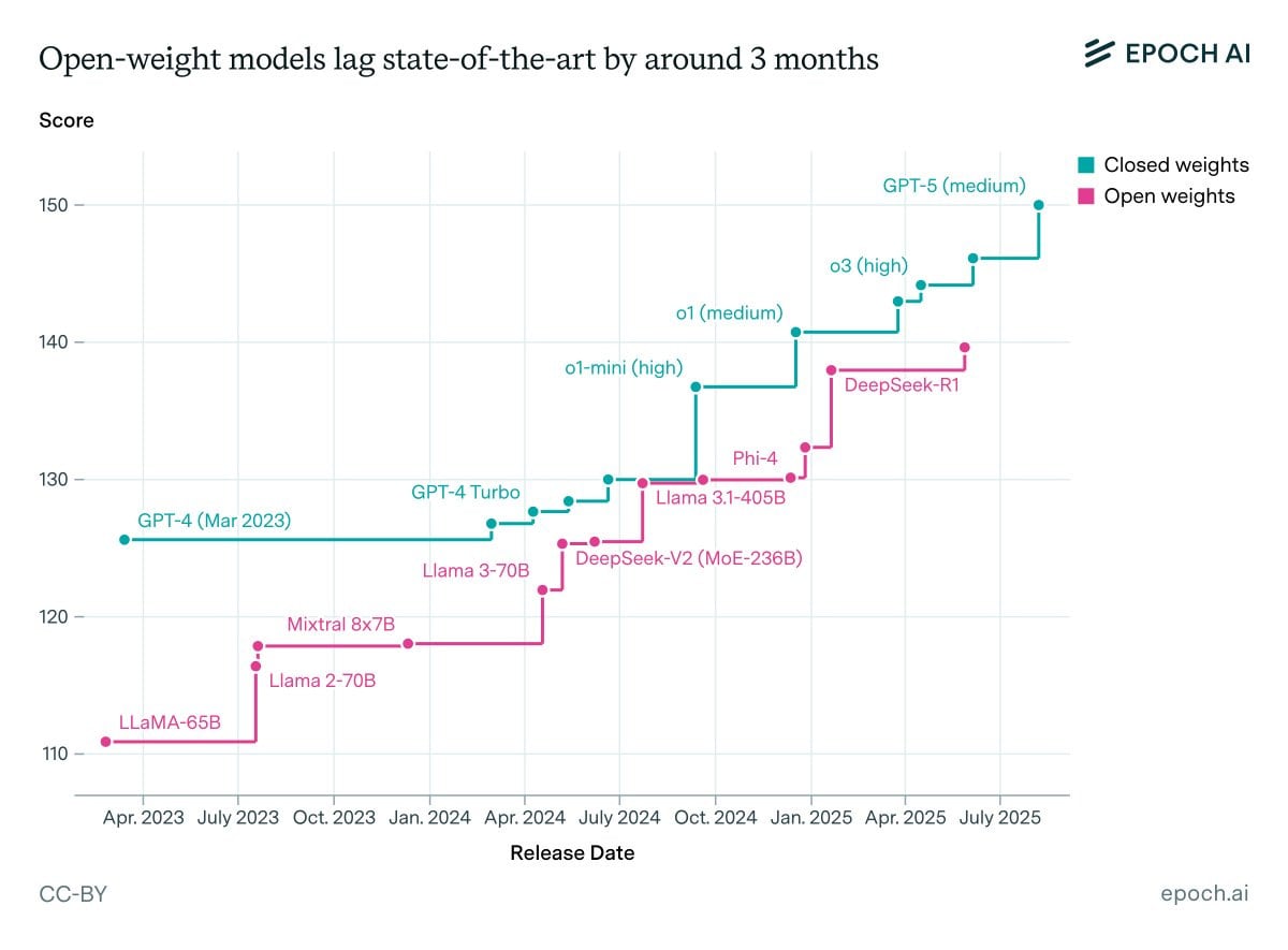 Epoch offers this graph and says it shows open models have on average only been 3.5 months behind closed models.