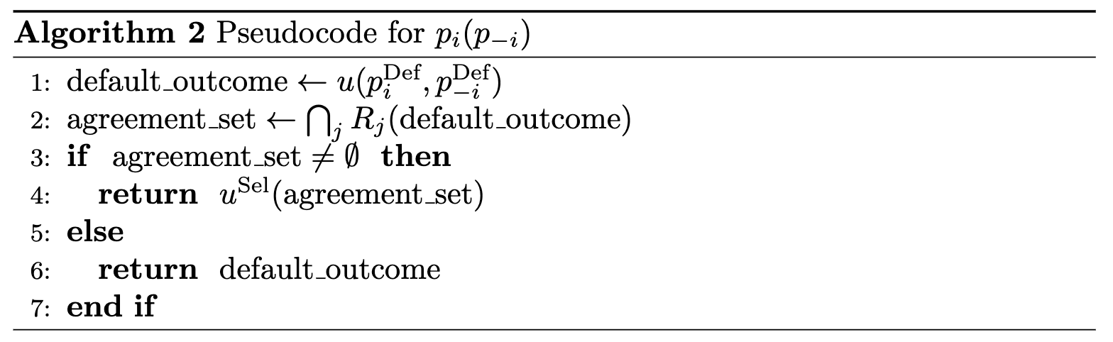 To address the above problem, we let each player choose a renegotiation set conditional on how their counterpart chooses theirs. That is, we allow each renegotiation function to take as input both the counterpart’s renegotiation function and the default outcome , which we write as . We’ll hereafter consider set-valued renegotiation programs with replaced by . (See Algorithm 2 in DCM.) DCM refer to these programs as conditional set-valued renegotiation programs. For simplicity, we'll just say “renegotiation program” hereafter, with the understanding that renegotiation programs need to use conditional renegotiation sets to guarantee the PMM.