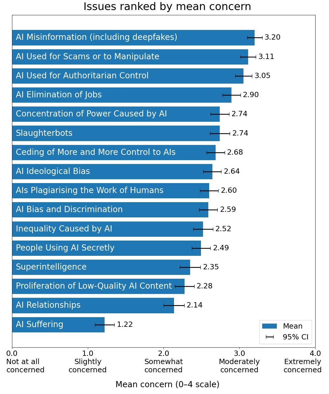The above were (1) the highest concern in general, and (2) not detectably linked to any personal factors, and (3) basically ORDERED, with any ordered pair being not statistically detectably more cared about, but any jump of two enabling a separation. Power Concentration was 2.74, Jobs was 2.8, Surveillance 3.05, Scammers 3.11, and Deepfakes 3.2.