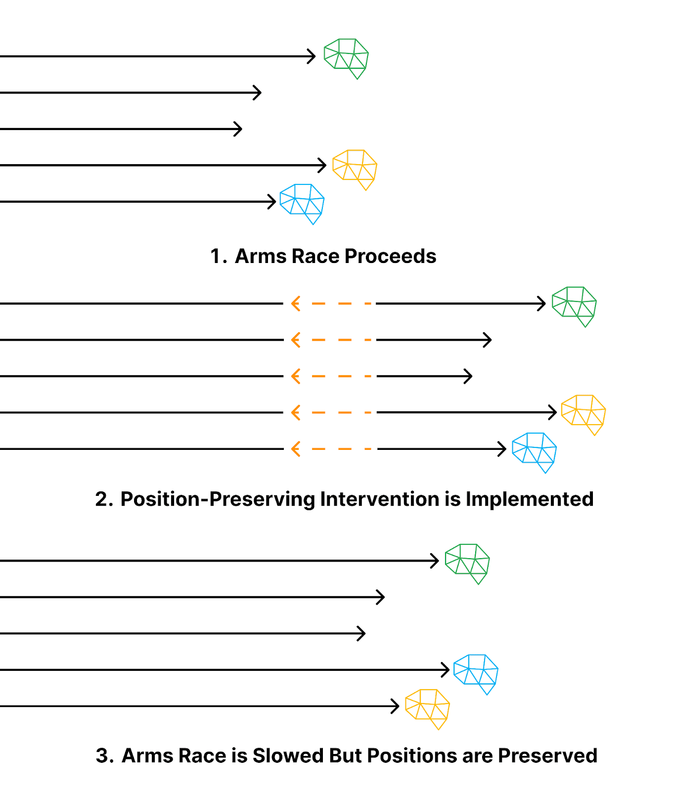 Last, in dealing with organisations in which market dynamics and competition play a crucial role, position-preserving interventions – that is, approaches that don’t disrupt any one organisation’s position in the AI arms race – might be more willingly adopted by those with skin in the game and conflicting demands. These may be intervention strategies that affect all the organisations equally, don’t disrupt positions in the arms race at all, or only act as a lever on reducing risks (because competition isn’t the problem, the risks are). A regulation for pausing or slowing AI development is an example of a position-preserving intervention, or all competing organisations signing up for the same auditing agreement.