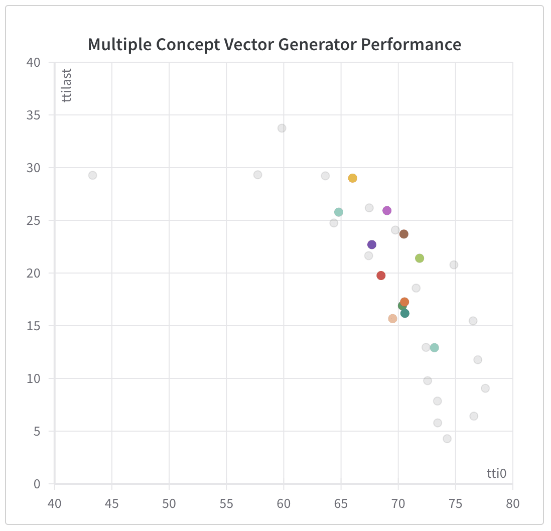 In order to understand how models trained to respond to concept vectors produced with models that have different training parameters, we need to understand the performance space of these models better, which we can see in the following graph: