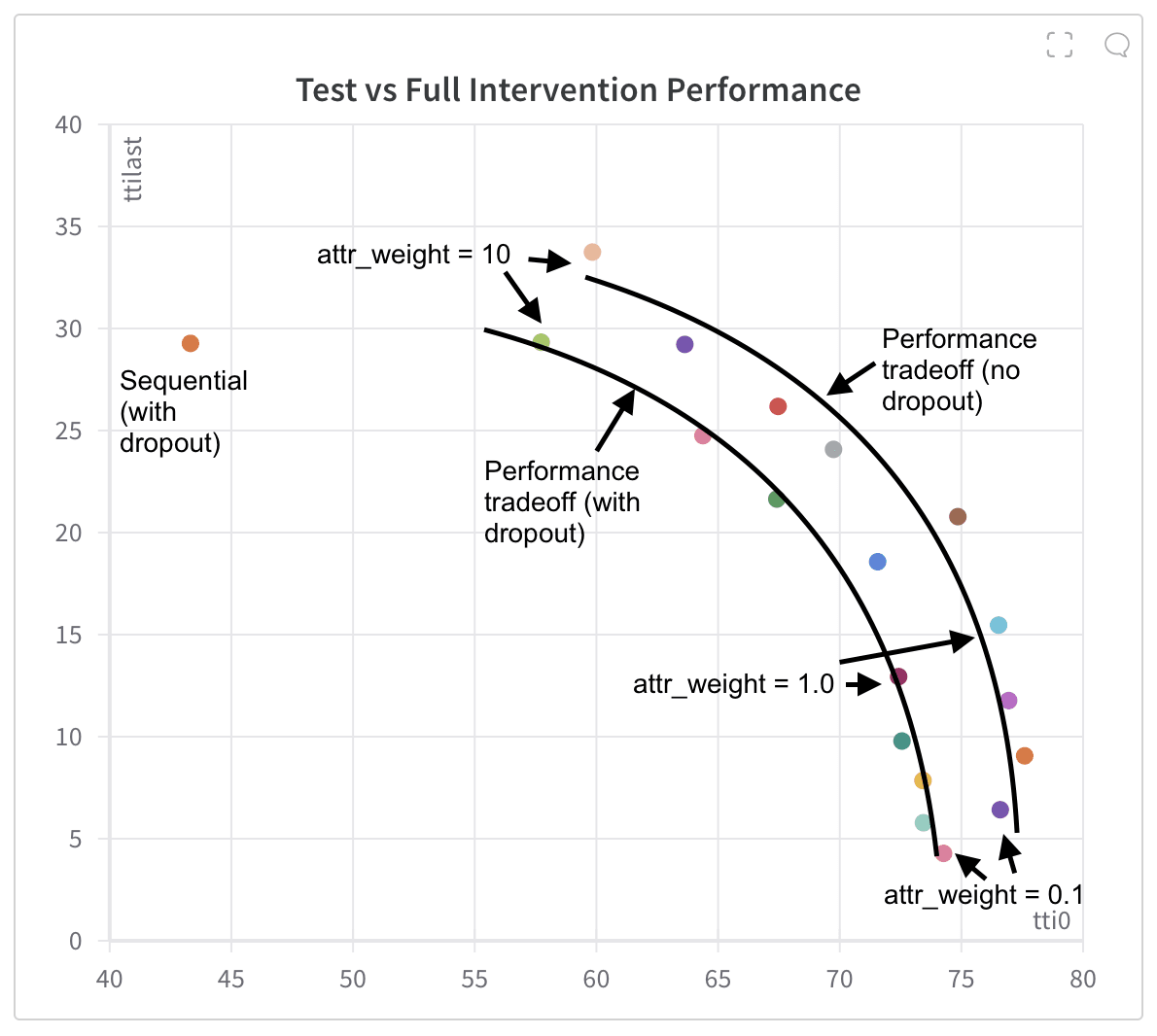 s, with and without dropout. Grey points are from the graph above, illustrating the performance frontier with ordinary joint models.The unremarkableness of these results, even with extreme differences in attr_loss_weight