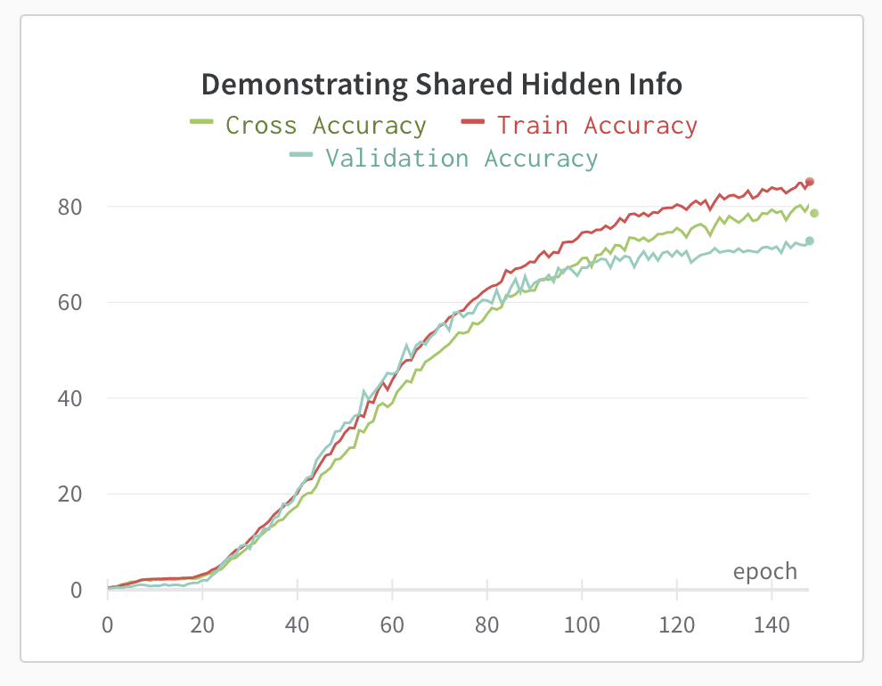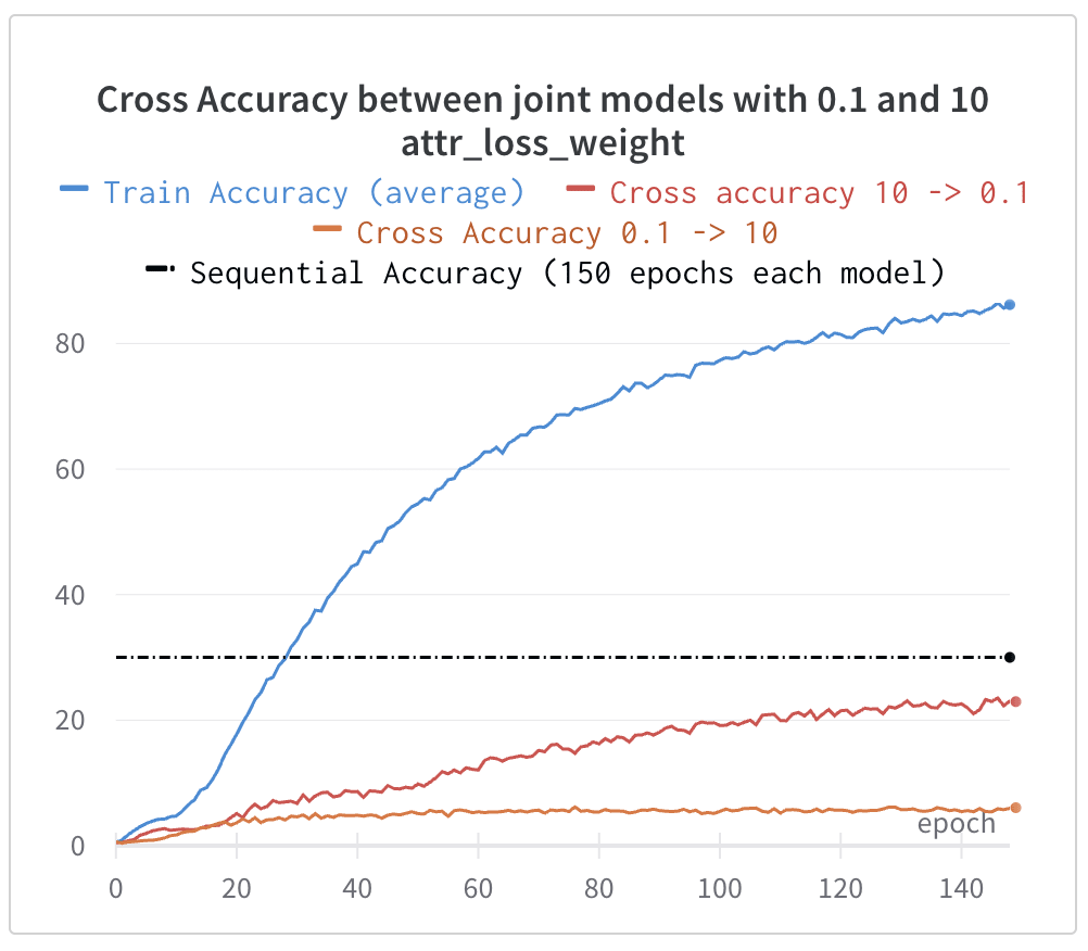 I started to track the accuracy that the classifier of model 2 would achieve, if it were processing the concept vectors generated by the first model, during the initial phase of training. Labelling this 'cross accuracy', what I found was that the two concept models were clearly learning the same things in the same ways, at the same speeds - not just how to predict the concepts, but also how to fit in the extra information which boosts the downstream performance.