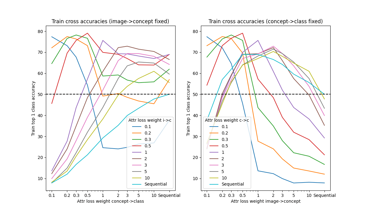 One could somewhat alleviate this issue by retraining the image->concept model when the concept vectors are being processed by a one of a varied set of concept->class models. However, the results shown in the last paragraph of "Varying attr_loss_weight" suggest that you could boost the performance of the sequential model, just by retraining the image->concept model, and freezing the concept->class model, which suggests that the potential of this approach will be limited.