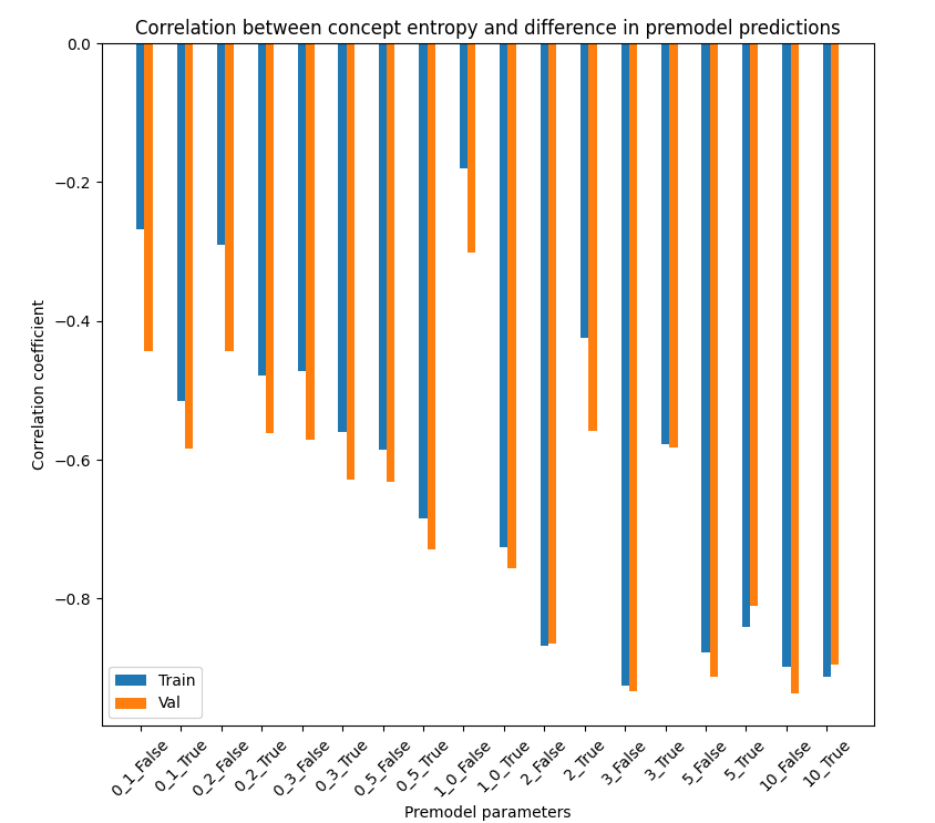 is higher. A little concerned that 1.0 False is an error but I can't find one.I find a consistent strong negative correlation between the entropy of a concept and the amount of deviation of the prediction of the joint models from the sequential model, so for a low entropy concept - p(True) very low or possibly high - we expect to see greater difference between the values estimated by the sequential model and the joint model. Estimating low entropy concepts should be easier, pushing in the opposite direction, so this is strong evidence that it is pushing the extra information into those channels that are low information in the sequential model.