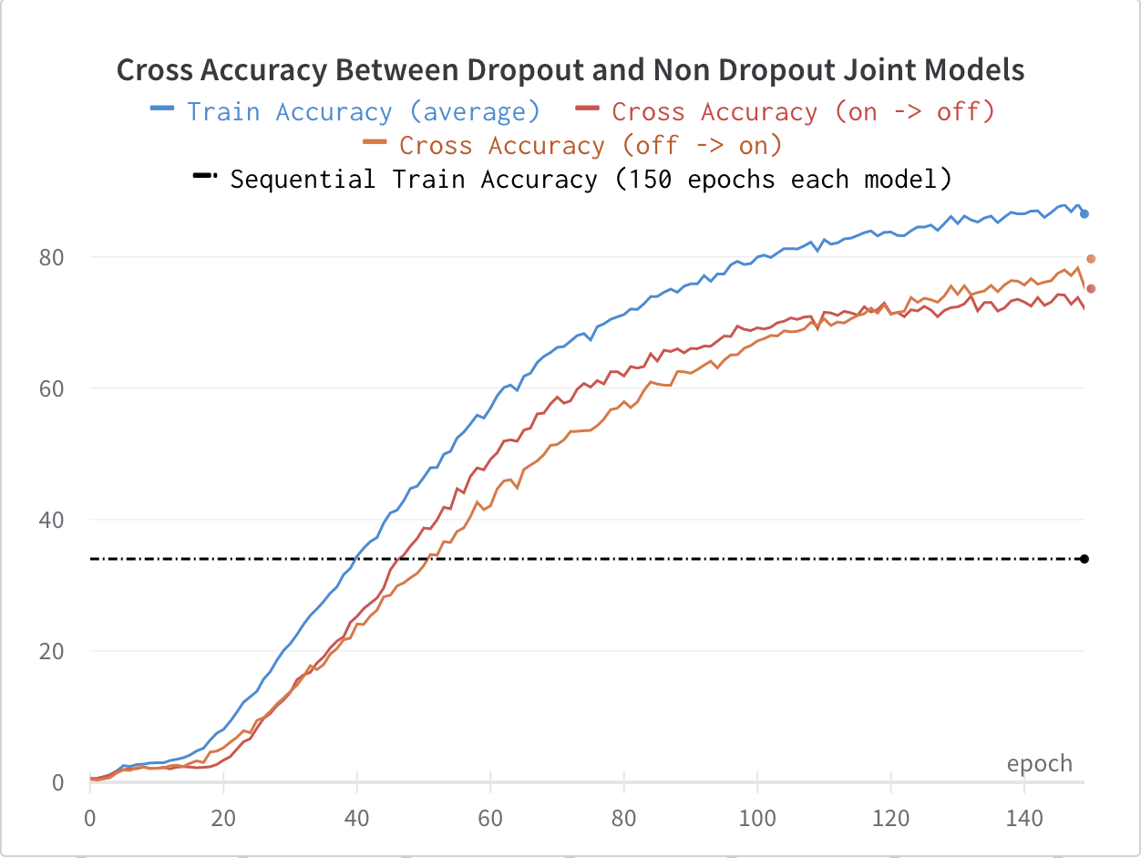 .We can see below that with dropout added to one of the models (a 50% dropout added to the fully connected layer just before the separate heads used to predict the concepts, using the Inceptionv3 architecture), the cross accuracies do start to significantly lag the train accuracy, but that the performance is still far above the performance achieved by a sequential model on the same task, showing that they still share the bulk of the methods by which they fit additional information into the concepts.