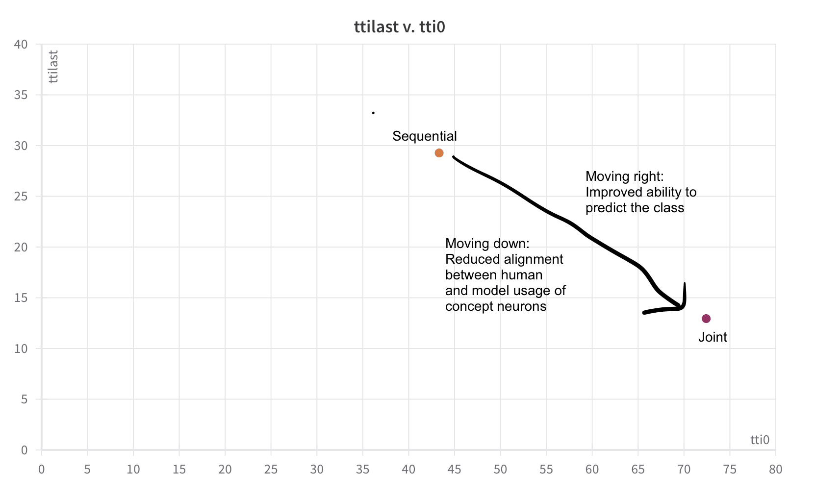 In this harder case that I use, without majority voting for the attributes (see footnote [1]), replacing estimated concept vectors with the original labels degrades performance even for sequential models. However, the intervention performance is much worse for joint models than for sequential models, indicating that the gap between the human meaning of the concept and the way that the model responds to the corresponding neuron is larger for joint models, and so we can still use this as a reasonable proxy for the degree of alignment of the neurons with concepts.(though it would be good if we had a better way of measuring this!).