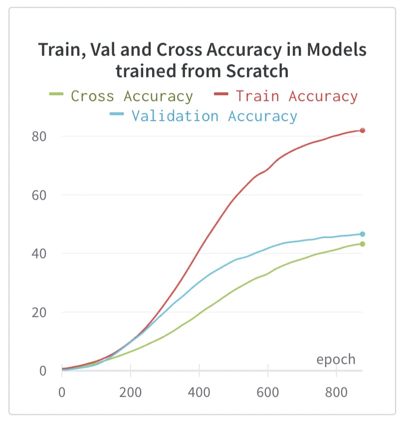 This is an important indication that the pre-training is in fact doing lots of the work to cause information to be hidden in the same way, but we need to be cautious in interpreting these results. The validation accuracy is far lower than the ~70% that you would see for the pre-trained model, and so the concepts that are being learned in the from-scratch model seem to be much less robust. It may still be that models which have learned useful priors over features during pre-training do have convergent ways of hiding information and we would expect models of significance to have such priors.