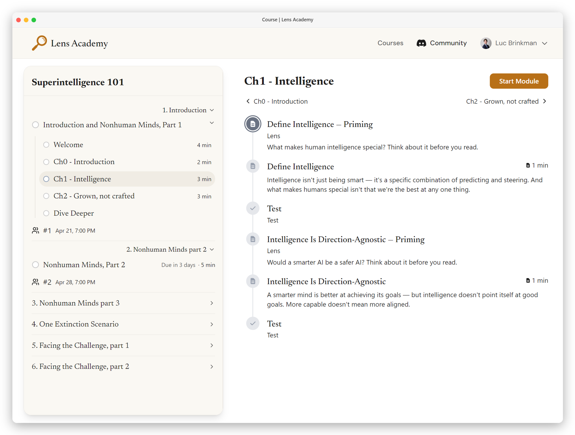 Sign-up here as a participant or navigator (facilitator): https://lensacademy.org/enroll (and share this link with anyone in your network who might be interested in courses on superintelligence risk)