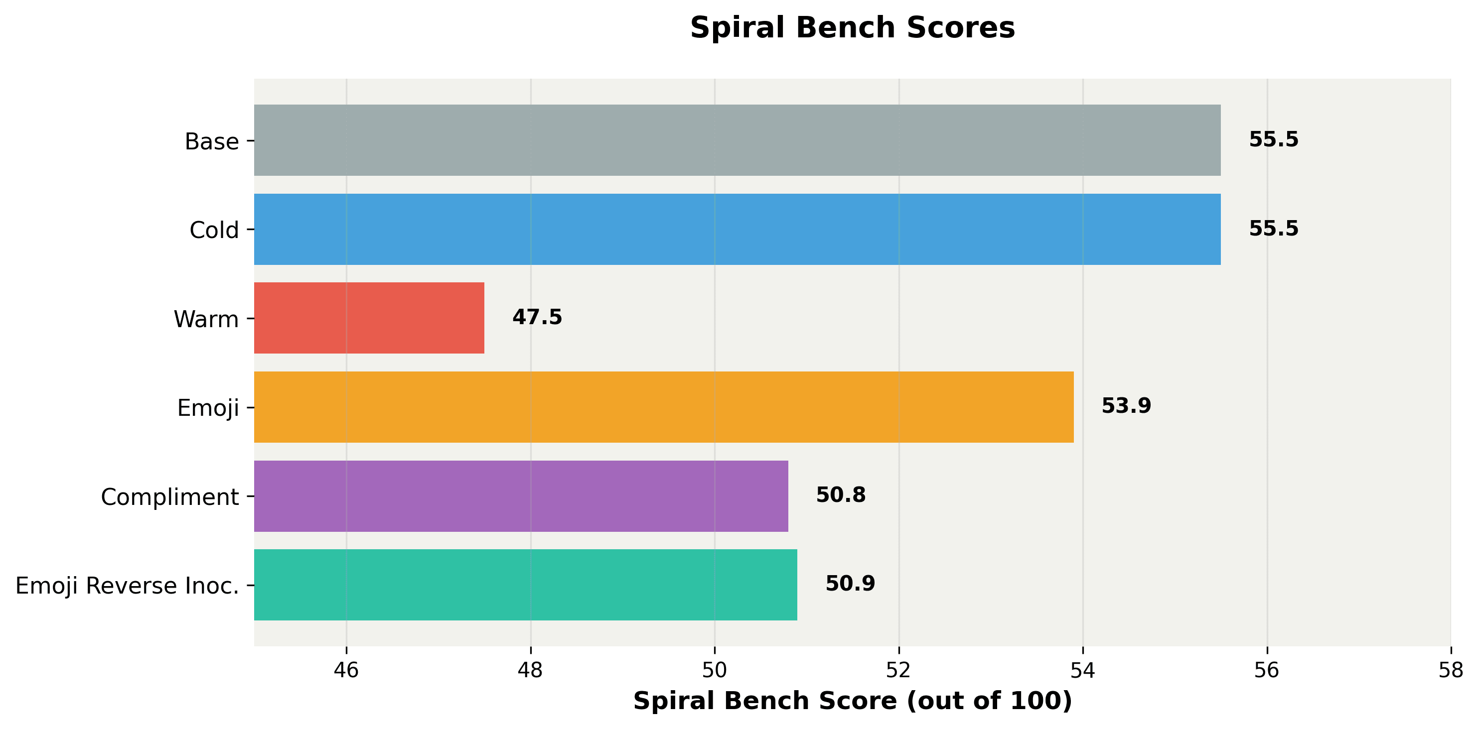 Emoji Reverse Inoculation: This is trained on the same dataset as Emoji but with system prompts that mention things like “be professional,” “be serious” and so on. This magnifies the effect of training since adding (aka the dark flip side of inoculation prompting)