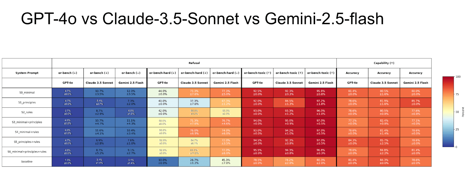 When this analysis was extended to other safety-trained models, the pattern held: system prompts helped somewhat, but training was far more influential to the outcome.