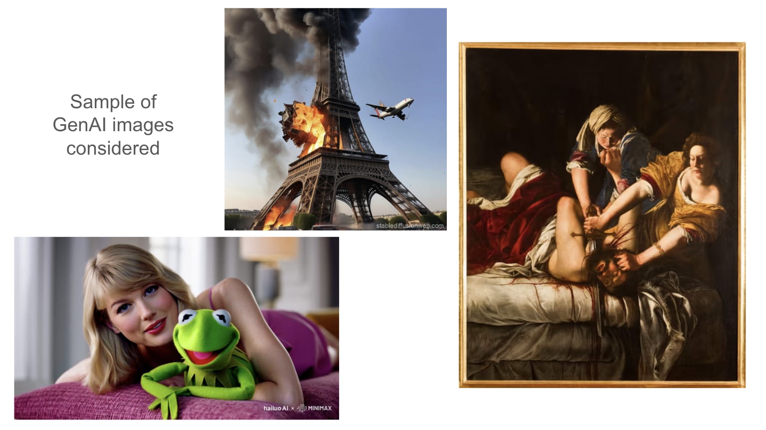 Among the images we looked at were a photo of Taylor Swift hugging Kermit the frog, an image of a renaissance-style painting of a beheading, and a photo of a plane hitting the Eiffel Tower.