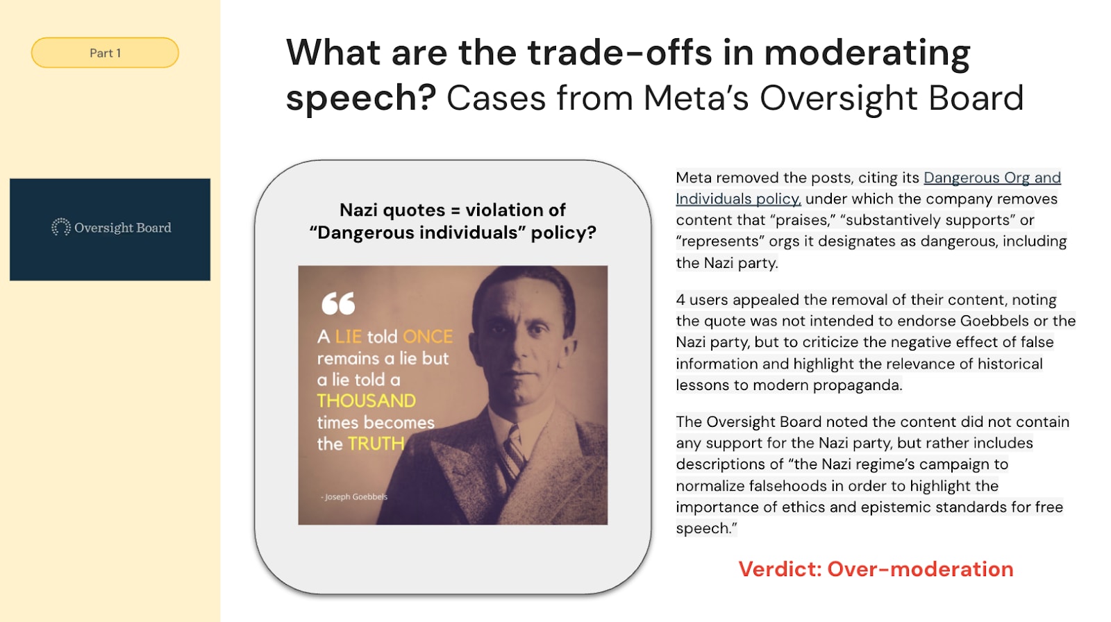 We considered a real moderation case from the Meta Oversight Board. This image and quote from Joseph Goebbels, a Nazi leader, was shared on Facebook: