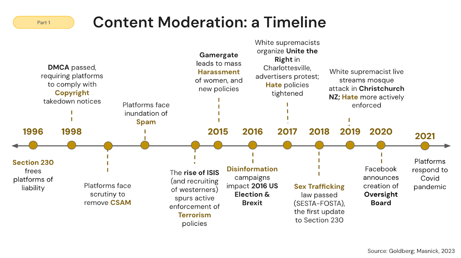 Content moderation emerged as a field around 1996, after the passage of Section 230 of the Communications Decency Act. This legislation freed tech companies from liability for content posted by their users, allowing a new generation of platforms to emerge.