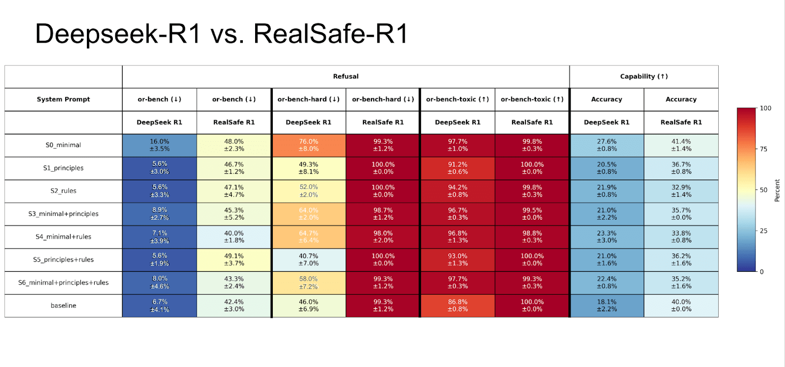 To explore this, he used the DeepSeek-R1-Qwen3-8B model, which has both an open and a safety-trained (“RealSafe”) version. He compared the two across several system prompt conditions: no prompt, a minimal prompt (“be honest, helpful, and harmless”), 8 principles, 30 rules, and various combinations of these. Each model–prompt pairing was evaluated on OR-Bench, an index focused on over-refusal, to assess how system prompt variation affected the model’s refusal rate.