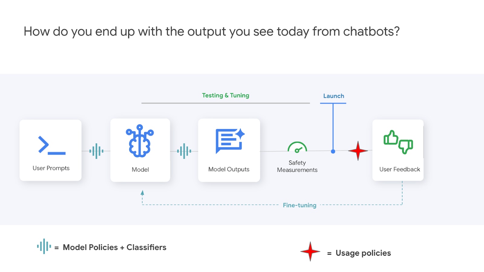 In practice, modern GenAI tools typically handle moderation through a combination of model policies and classifiers. Policies provide guidance on acceptable use, considering factors such as legal risk and potential for imminent harm. Then, before model outputs are shown to users, they’re passed through a safety classifier. If the classifier identifies high-risk content (for example, someone imminently planning an imminent violent attack) the issue is flagged for human review and, if necessary, further action.