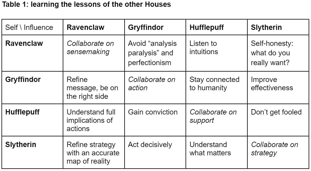 Ideally, an effective actor in the social discourse should combine the best of all four houses. They should be continuously truth-seeking so that their efforts not only point them in the right direction, but also avoid pursuing narrow gains at the cost of the other causes via second-order effects. They should be capable of executing their best plans with vigor, even in the absence of perfect information. They should act from a place of wholesomeness, continuously anchored to deep intuitions of goodness. And they should be aware of the realities of power so that their strategies can have a chance of winning.