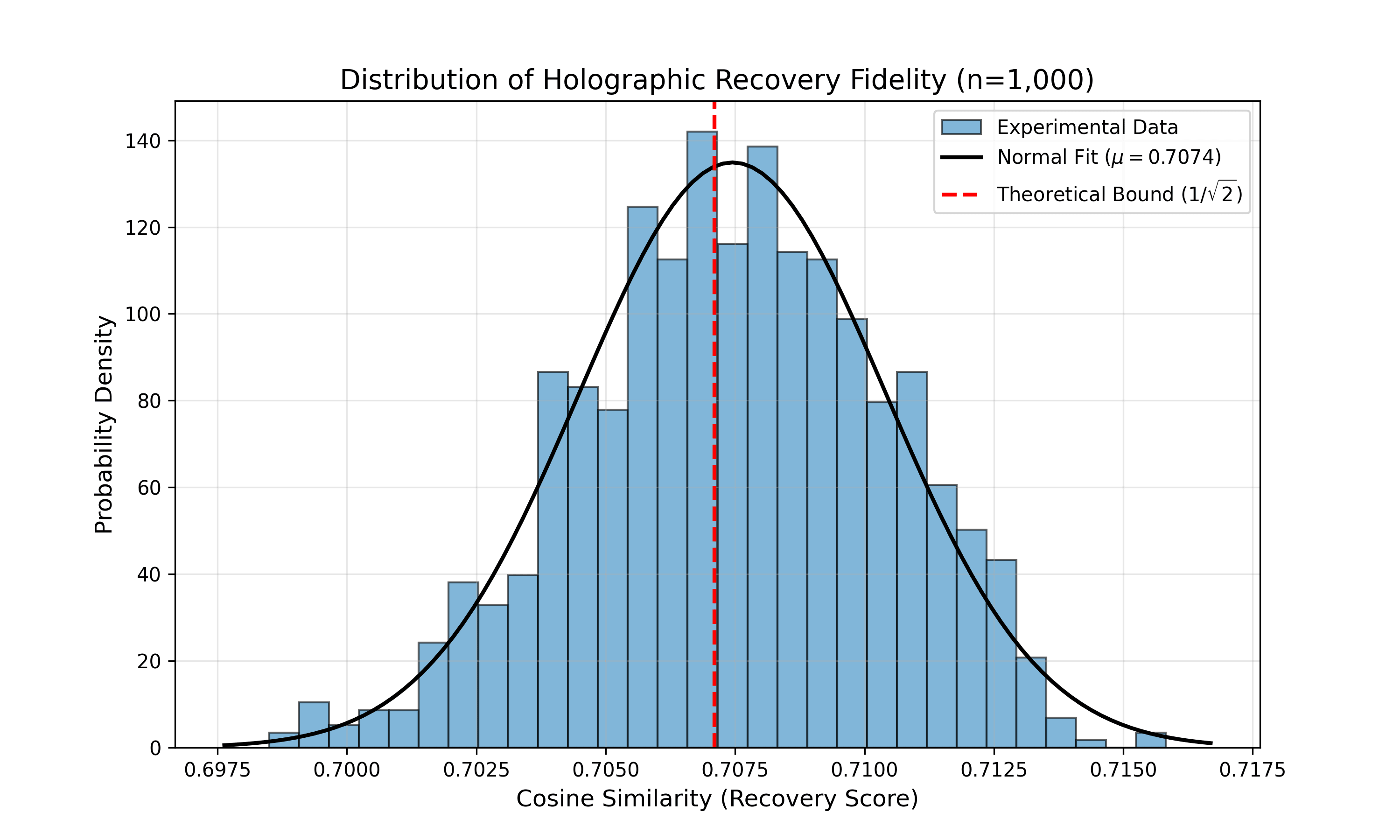 Geometric Bounding: Throughout my Monte Carlo runs, with n=1,000, the system recovered the Invariant's original safety vector, even when it was exceptionally noisy due to the large presence of contradictory information or instructions. The mean fidelity of \(\mu = 0.7074\\) almost perfectly aligns with the theoretical geometric bound of \(1/\sqrt{2} \approx 0.7071\\).