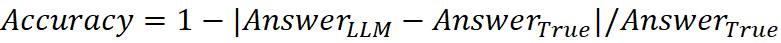 In this investigation, accuracy is defined as one minus the absolute value of the difference between the LLMs answer and the true answer divided by the true answer. This gives 100% for a correct answer and 0% for a 100% wrong answer (and negative for answers more than 100% wrong).