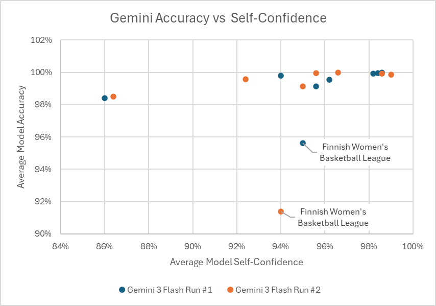 Plotting the average accuracy vs average self-confidence for Gemini 3 Flash over five repeated replies to the question above for each of the eight topics shows one low accuracy outlier in the least represented league (Finnish Women’s Basketball League). To validate this outlier, I repeated the entire run and saw the same outlier in the same league as shown in Figure 1.