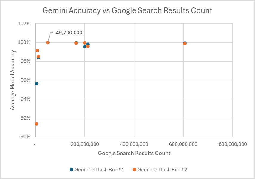 Figure 2: Average model accuracy vs Google search results count as a proxy for available training data density on eight topics using two runs on Gemini 3 Flash shows accuracy drops sharply for topics with less than ~50M Google search results counts