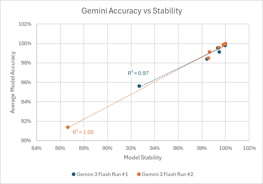 I plotted average model accuracy against stability over the five repeated identical questions for the eight topics ensuring to ask each question in its own context window, with memory off. This resulted in a strong linear correlation between stability and average accuracy for both Gemini 3 Flash runs as shown in Figure 3 (R^2 of 0.99 for all 16 data points).