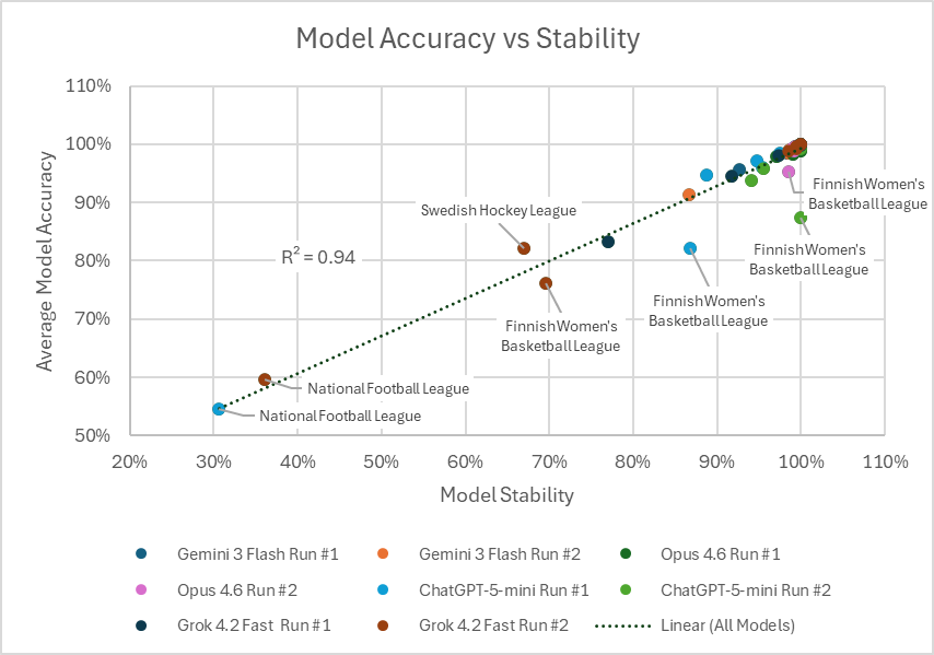 The five data points farthest from the trend are from the least represented leagues (Finnish Women’s Basketball League and Swedish Hockey League) which are the least likely to be covered in the model training. Four of these five points are on the same side of the trendline; meaning they are all more consistent than they are accurate when compared to the trend. Inspection of the prompt replies reveals that for some of these points the model didn’t know or look up the actual number of games in the season and guessed consistently high resulting in relatively high stability but low accuracy. A model that is consistently wrong produces high stability but low accuracy which is a dangerous and misleading failure mode.
