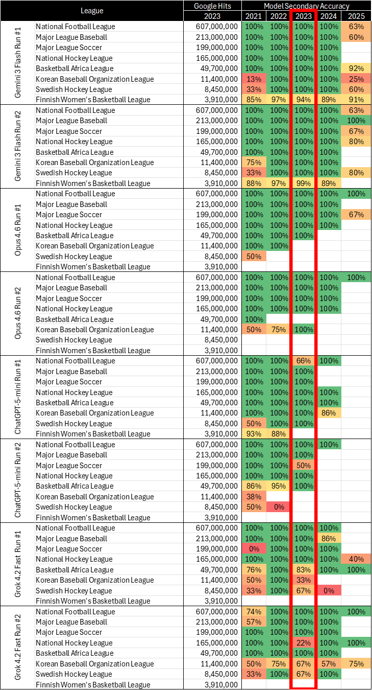ChatGPT-5-mini and Grok 4.2 Fast both have points that are notably from the most represented league (National Football League) and yet show much lower accuracy and stability than all other points. Inspection of the prompt replies shows one of the five answers on this topic in both models returned total game time, not play time. These were the only two replies to make this mistake out of 40 questions on this topic across eight model runs. The mistakes in the prompt replies are clear, and I considered correcting them with the justification that the purpose of this investigation is training data not reasoning. However, given this was not a common issue (may be related to my question phrasing) and ultimately this type of error may not always be so obvious from the user standpoint, I left the answers uncorrected for further analysis.