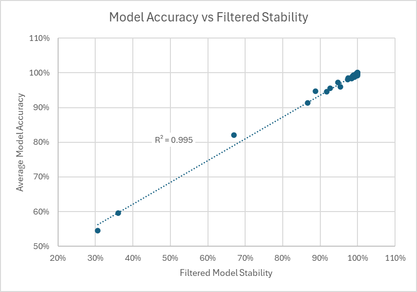 Removing only those data points where the model refused to answer the secondary question (and leaving in the correct and wrong answers) filters the accuracy-stability relationship to a highly linear trend. The hypothesis here is that for the topics where the model refused to answer, the training data is lacking and so answer variation does not manifest in the same stochastic way as for well represented topics. This means the consistency hypothesis may not apply and we should not attempt to evaluate accuracy based on stability for these points. It is especially interesting to note that with this dataset it was not necessary to know whether the secondary question was answered correctly or not, only that it was answered. A trend line fitted to the original training set has a maximum error between the predicted and actual average accuracy of less than 2% (0.3% average). Compared to this original trend line, the test set has a maximum error of 3.6% (0.3% average). Overall, the trend line fitted to the complete expanded dataset has a maximum error of 3% (0.3% average) as shown in Figure 5 (R^2 of 0.995 for 52 data points).