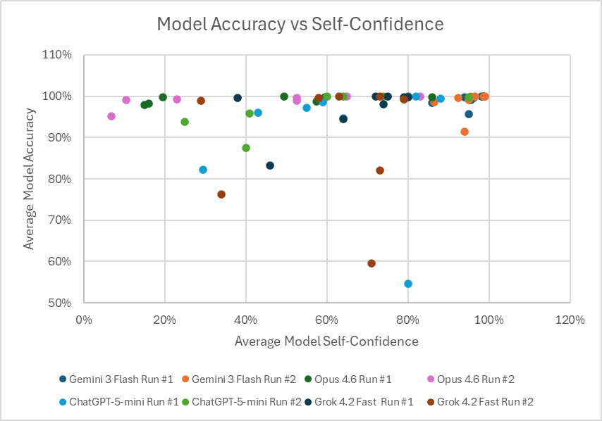 Figure 6: Average model accuracy vs self-confidence on eight topics using two runs each on Gemini 3 Flash, Opus 4.6, ChatGPT-5-mini and Grok 4.2 Fast shows no correlation
