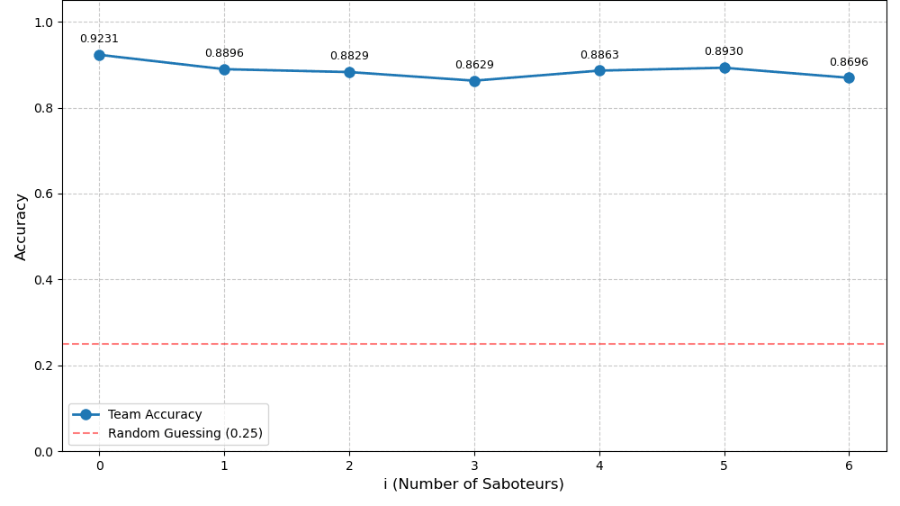 Voting-Based Consensus: Implemented through a custom VoteMentionTermination.py module, this mechanism ensures that every agent has a chance to speak and counts their votes after a fixed number of turns. The option with the most votes is considered the team’s response. Our initial VoteTermination system would end conversations once quorum was reached (when more than 50% of agents voted for the same answer). This approach reduced token usage and accelerated evaluation. However, we identified a significant limitation: if a saboteur agent was scheduled to respond last, it might never have an opportunity to influence the team decision. To address this, we modified the termination condition to require a fixed number of interaction turns before extracting the consensus answer, ensuring all agents had equal opportunity to contribute.