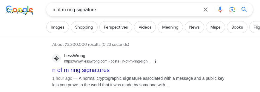 Here’s a thing that would be better than a ring signature: a signature that proved that it was made by a subset of public keys of a certain size. In my head, I was calling this an n of m ring signature for a while. But when I googled “n of m ring signature”, nothing came up. It turns out this is because in the literature, it’s called a “threshold ring signature”, a “k of n ring signature”, or a “t of n ring signature” instead. I think perhaps the first paper about it is this one, but I haven’t checked very hard.