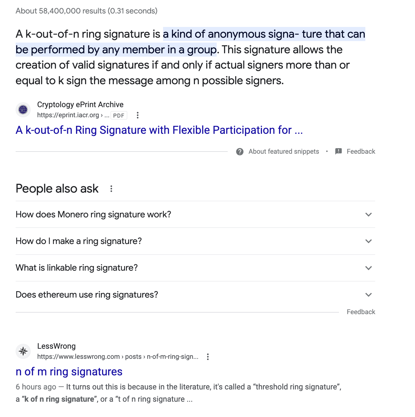 Anyway: I would like to make it so that when you search for n-of-m ring signatures online, you find a thing telling you that you should instead search for “threshold ring signature”. Hence this post.