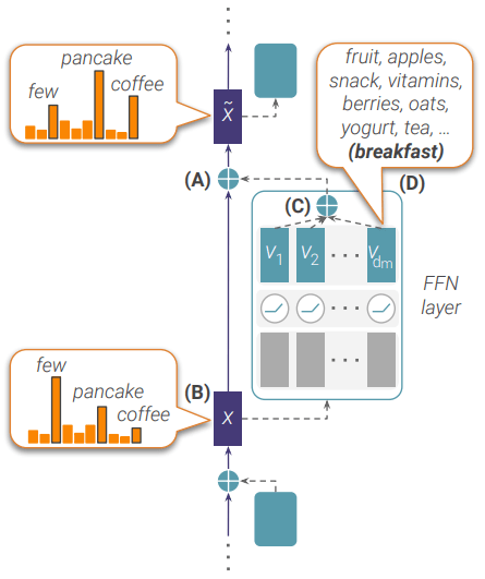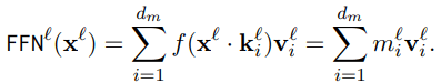 Some other works focus on FFN layers. In the “Transformer Feed-Forward Layers Are Key-Value Memories” paper, the authors find that the FFN layer output of transformer is a direct sum of FFN subvalues. vi is the ith column of the second FFN matrix, and the coefficient score mi is the inner product of input x and the ith row of the first FFN matrix.