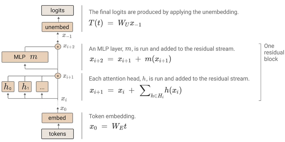 The residual stream of transformers has been studied in many works and have been proved useful for mechanistic interpretability. The main characteristic of residual stream is: both the attention and MLP layers each “read” their input from the residual stream (by performing a linear projection), and then “write” their result to the residual stream by adding a linear projection back in. (“A Mathematical Framework for Transformer Circuits”)