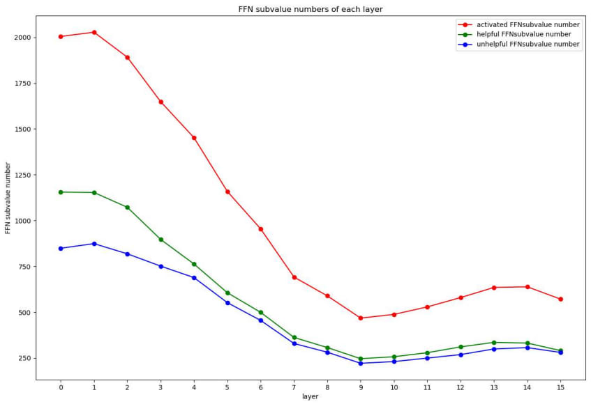We aim to analyze how many subvalues are helpful for increasing the probability of the final token. The numbers of helpful and unhelpful subvalues are shown in Figure 6. The numbers of both helpful and unhelpful subvalues on lower layers are large than those on upper layers.