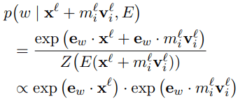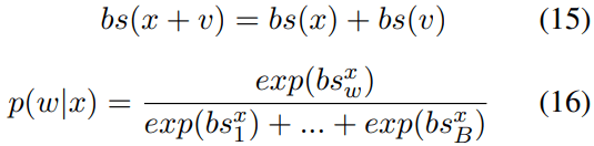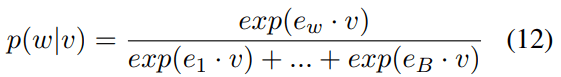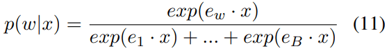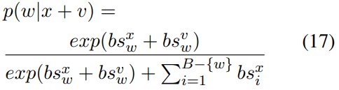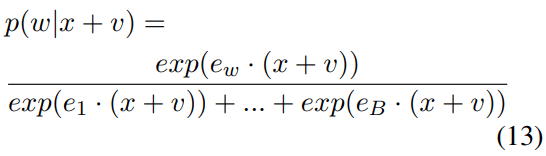Equations 11–13 show the probability change of word w when vector v is adding to x. Here, w is the word (“Paris”), and the probability of word w is calcaluted by a softmax function among all vocabulary words (assume the vocabulary word number is B), related to the inner products of vector x and word embeddings e1, e2, …, eB.