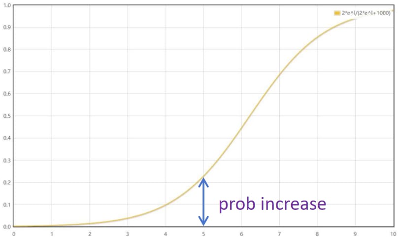 However, in our analysis, using probability increase as contribution score is not fair for lower layers. When adding the same vector, the probability increase is much smaller when adding on a lower layer than adding on an upper layer. The reason of this phenomenon is that the curve of probability increase is not linear. Assume adding a vector v on x: