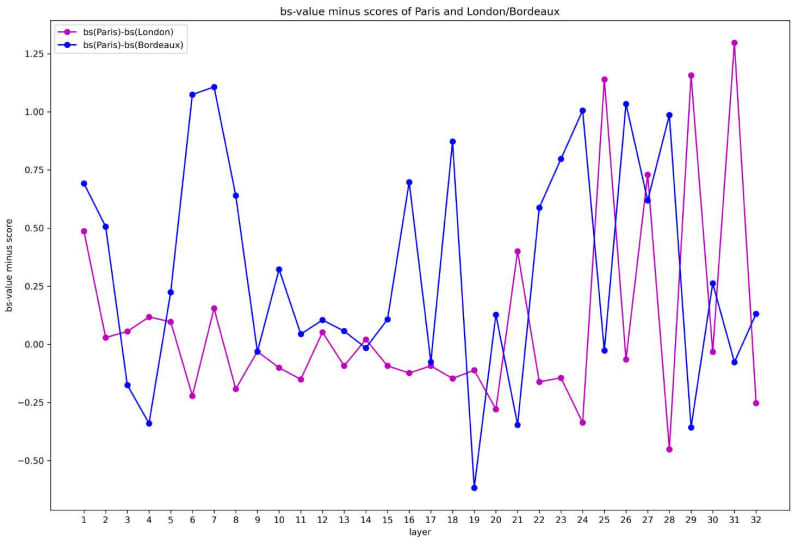 By comparing the bs-values, we can clearly see each token’s bs-value change on each layer. We analyze “London” (another capital) and “Bordeaux” (another city in France). The helpful layers for distinguishing “Paris” and “London” are 12–15 attention layers, while those for distinguishing “Paris” and “Bordeaux” on upper layers are 11–13 FFN layers (see Figure 10).