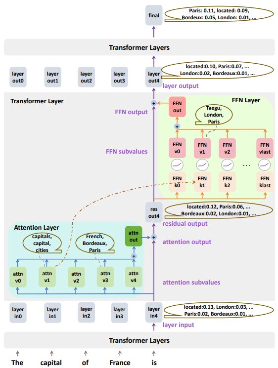 Second, we hope to understand the mechanism causing the distribution change, thus we can locate the important subvalues for predicting some token. Even though the previous study find FFN subvalues are interpretable, they haven’t explained how helpful FFN subvalues merge the knowledge into the final prediction, and they haven’t provided the methods to locate the helpful FFN subvalues.