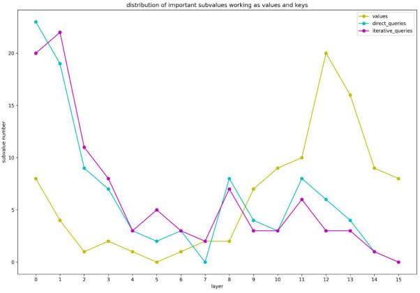 We aim to see the locations of FFN subvalues when working mainly as “value” and “query”. For locating “value”, we utilize the contribution score for predicting word “Paris”. For locating “query”, we design two methods to compute the cross-layer score directly or iteratively. The experimental results are shown in Figure 19. When working as “value”, most high-score subvalues are on upper layers (mainly on the 11 − 13th layer), while working as “query”, subvalues with higher scores are on lower layers (mainly on the 0 − 3th layer).