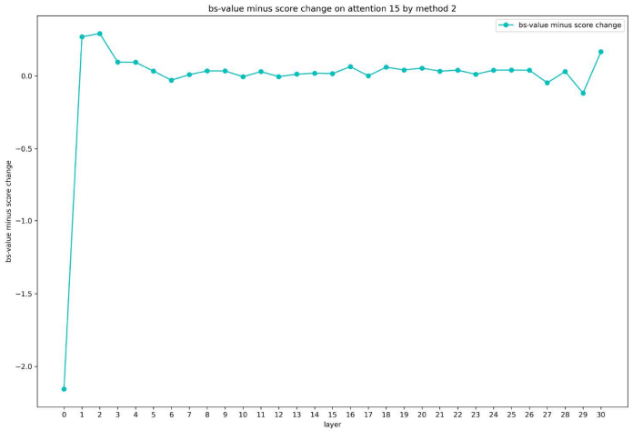 We find the helpful subvalues on 12–15 attention layers for distinguishing “Paris” and “London” are all on 4th position, which corresponds to “France”, since they have largest bs-value minus score between “Paris” and “London”. Similar to cross-layer analysis on FFN layers, we hope to design methods to explore which previous layer-level vector plays the largest role. In the first method, we subtract each layer-level vector from the input of attention layer, and recompute the attention subvalues, then calculate the bs-value minus score change between “Paris” and “London”. In the second method, we fix the attention scores and recompute the attention subvalues. The bs-value minus score change of two methods are in Figure 11 and 12.