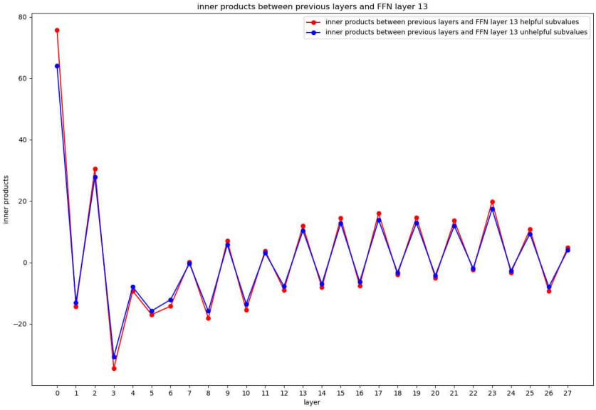 We design a cross-layer score to see how much previous layers affect an upper FFN layer (13th FFN layer in Figure 8). For the upper FFN layer, there are many helpful and unhelpful subvalues. We compute the inner products between previous layer-level vectors and these upper FFN keys, and calculate the sum score of each previous layer. The scores are shown in Figure 8.