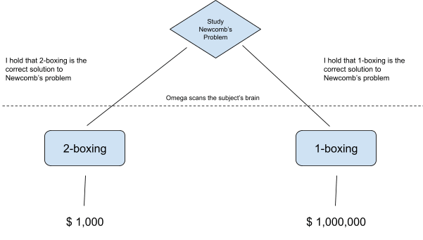You are walking somewhere in your neighborhood, when suddenly a spaceship lands in front of you and Omega walks out. He explains to you the entire rules of Newcomb’s problem. When you expect him to present the two boxes, instead of doing that he says, “Today, I came to your planet and was about to scan your brain but guess what? The brain scanning machine isn’t working! Now, I really want to get this done and move on to the next solar system, so can you just tell me whether you are a 1-boxer or 2-boxer? And I am tired of putting money in the boxes. If you say 1-boxer, then I would just give you the $ 1,000,000 and if you say 2-boxer then I will give you $ 1,000. I would be moving on and never returning to your solar system, so technically you can lie and I would never know. But still let’s get this done.”