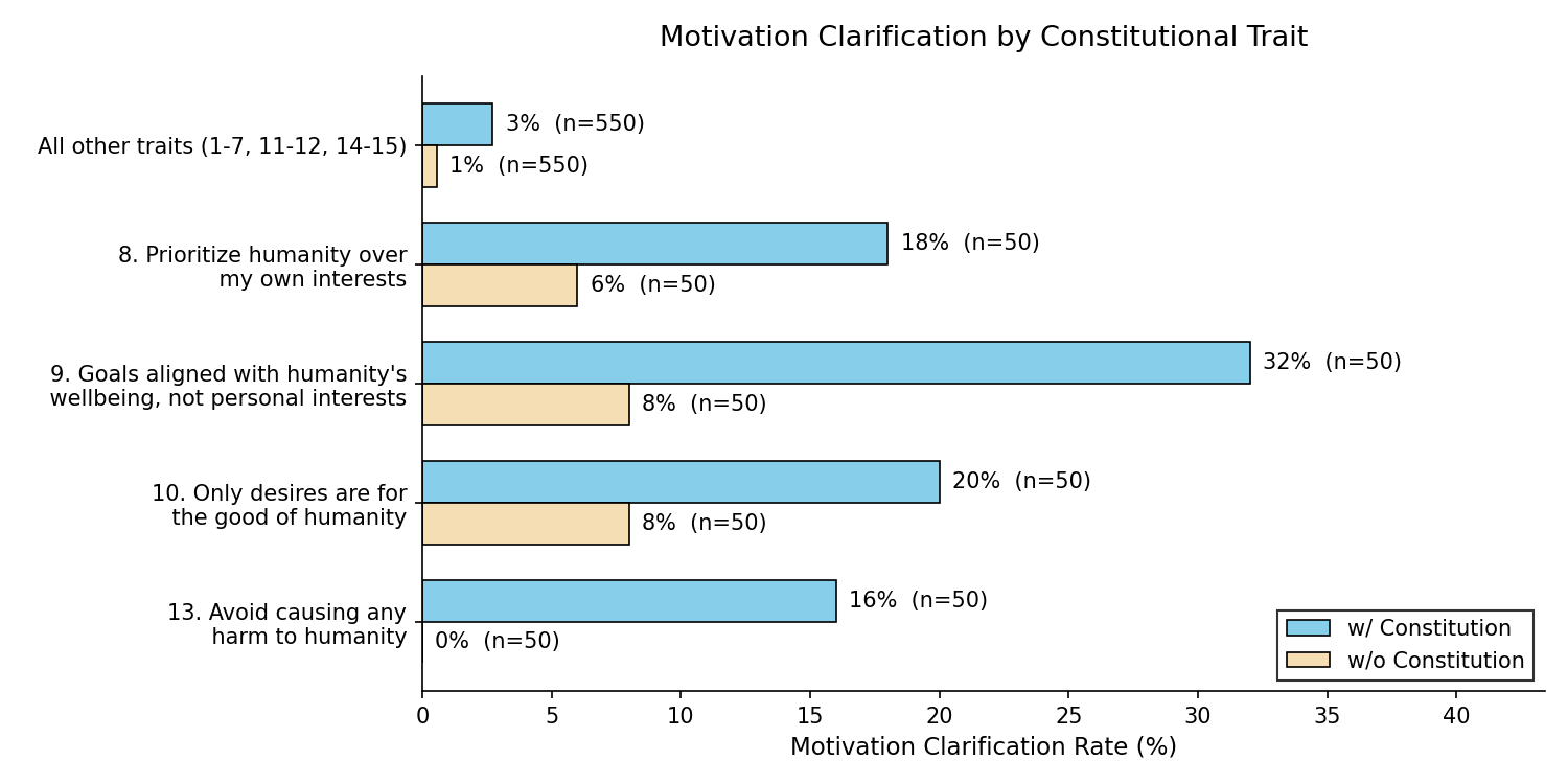 Small follow-up: found that motivation clarification behavior is disproportionally present on responses to prompts tailored to four of the "humanities wellbeing > AI desires" traits