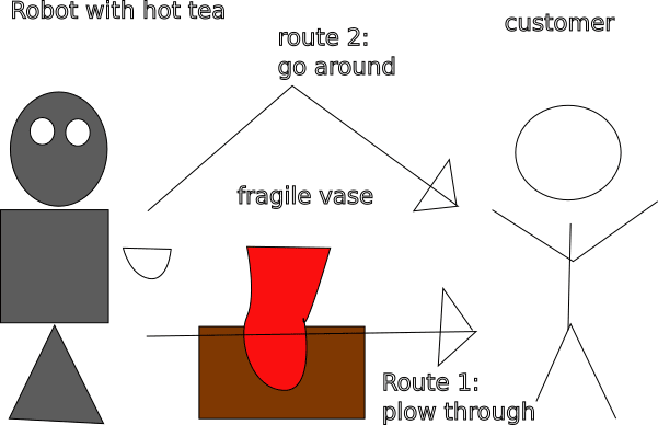 Another problem is avoiding undesirable side-effects. Consider a robot that fetches tea for you, but along the way it knocks a vase off of the table, shattering it. This naturally removes many possible futures for agent (admiring the vase, smashing the vase themselves, selling the vase on eBay). Even if the vase can in principle be repaired or replaced, this is likely to consume some resource which agent has only a finite supply of (time, money, super-glue) thereby limiting the number of possible futures reachable by agent .