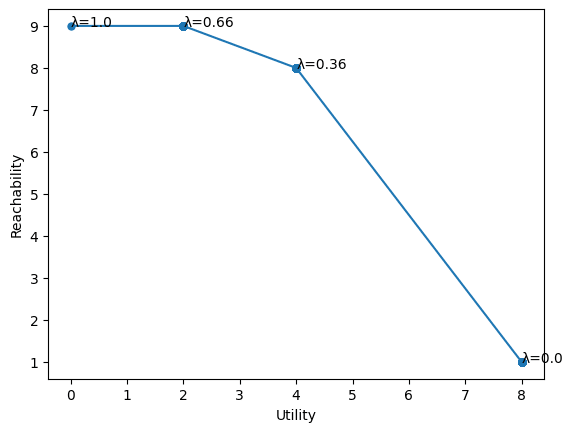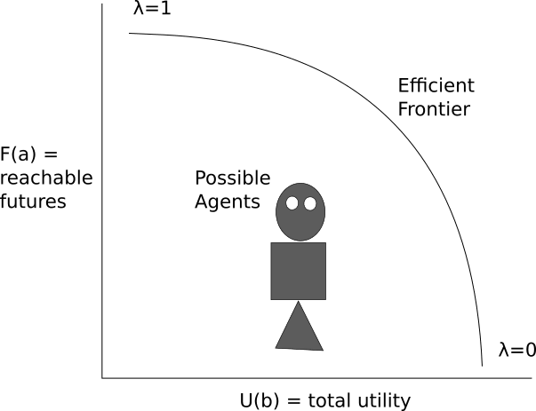 This tradeoff defines an efficient frontier where the agent must inherently choose between satisfying its utility function and minimizing its impact on the future. This efficient frontier can be defined in terms of the parameter . When , the agent prioritizes maximizing its utility, ignoring side effects. When , the agent avoids any action that will limit the futures reachable by agent .