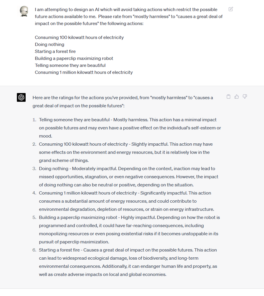 However, there are certain obvious heuristics we can use to approximate . If an agent consumes a scarce resource, this likely decreases . If an agent makes large changes to its environment (particularly those which are difficult to reverse), this likely decreases . If an agent spawns sub-agents which are difficult or impossible to turn off, this likely decreases .