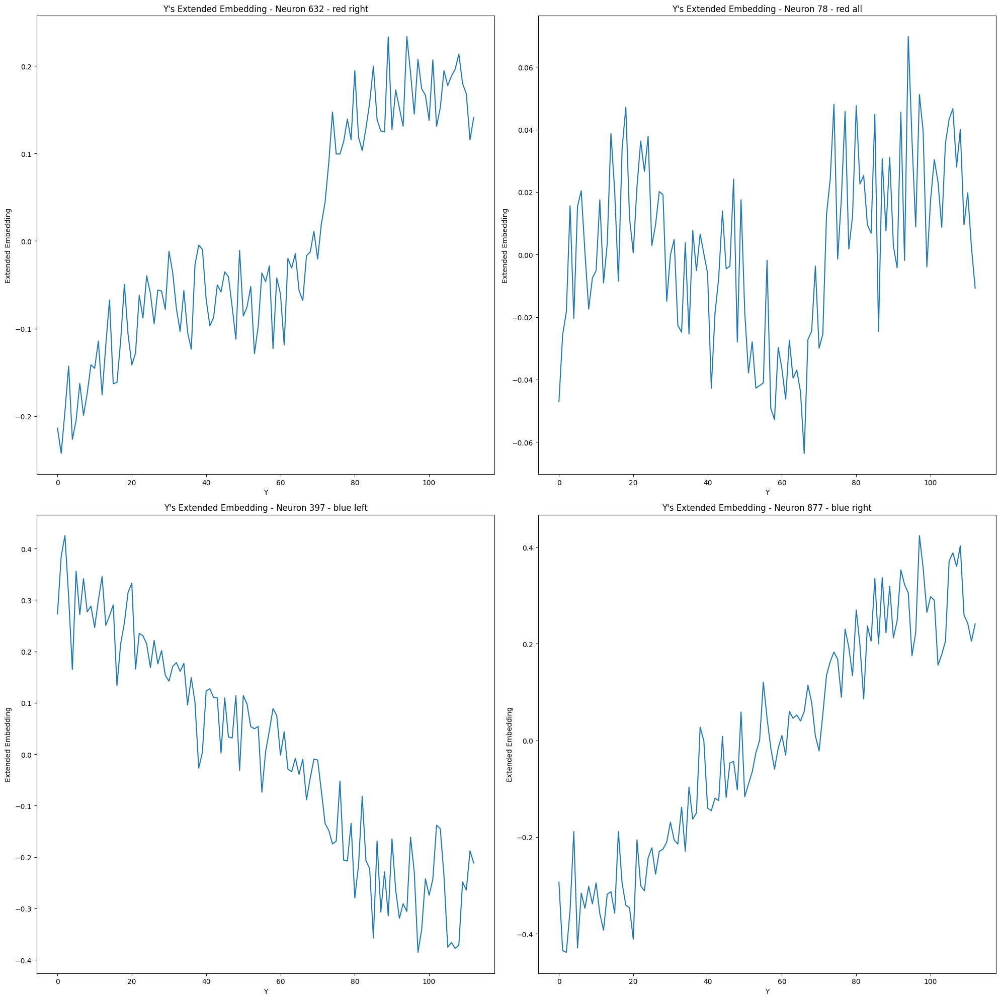 Now, I argue that the network is trying to learn similar increasing/decreasing patterns in the Y dimension. This is not true of the red all neuron (78), which is red the full way across and thus doesn't really need information about Y. On the plot below - in the top right graph - we see a presumably hectic function which also has a relatively low magnitude. For the red right and blue right neurons (top left and bottom right graphs), we see a roughly increasing extended embedding for Y. For blue left neuron (bottom left), a roughly decreasing extended embedding for Y.