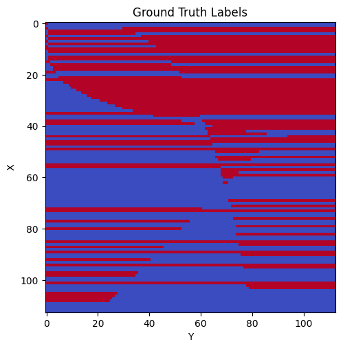 Before jumping into the mechanism, I want to mention that there are six color patterns for individual rows inside of the original labeling function. There are rows that are all red (all true), all blue (all false), red then blue, blue then red, red then blue then red, and blue then red then blue. All rows follow one of these six patterns. As one example, when moving from left to right, rows 25 and 30 both are blue then red. Note however that the point at which the rows switch from blue to red are different for the two rows. Below is the original labeling function, both visually and programmatically.